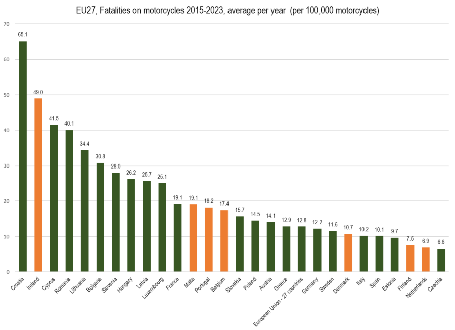 SMOTO teki vertailun eri maiden liikenneturvallisuustilastojen perusteella. Laskimme vuosilta 2015-2023 liikenneonnettomuuksissa kuolleiden moottoripyöräilijöiden määrän ja suhteutimme luvut kunkin maan moottoripyörien määrään. Tunnusluku on ilmoitettu 100 000 moottoripyörää kohti. Oheiseen kuvaajaan on oranssilla pylväällä merkitty ne maat, joissa ei ole moottoripyörille pakollista määräaikaiskatsastusta.